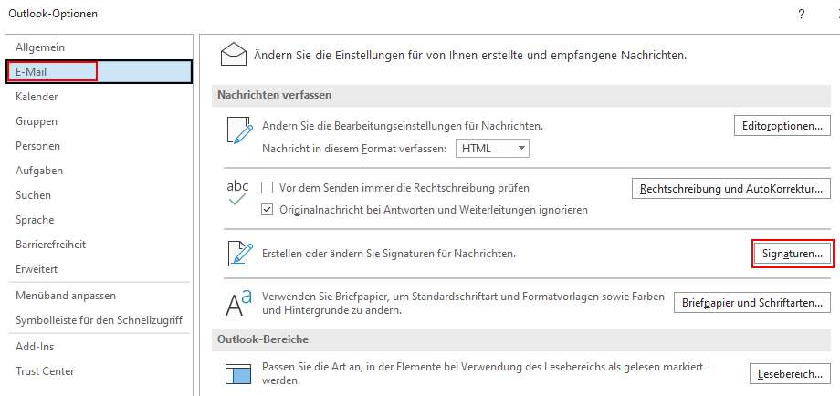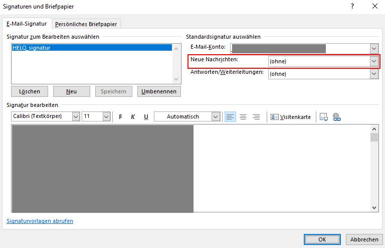 Signatur automatisch einfügen Damit Ihre Signatur automatisch bei jeder neuen Mail erscheint, wählen Sie bitte in Outlook den Punkt Datei: Dann wählen Sie bitte die "Optionen" Wählen Sie dann links "E-Mail" und dann "Signaturen" Wählen Sie Ihre Signatur unter "Neue Nachrichten" aus und bestätigen Sie mit "OK" Veröffentlicht 08.07.2022 10:18
